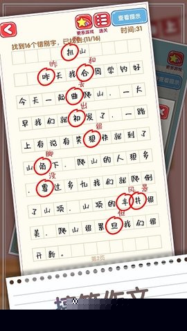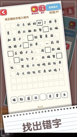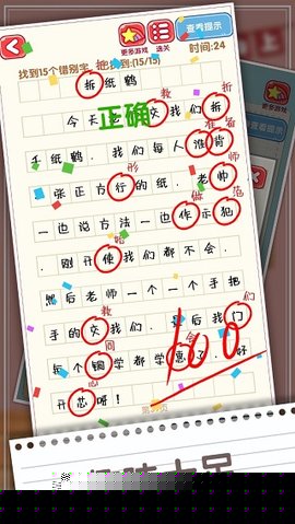 交互方式直观且直接。当确认某字存在错误时,轻触该字符即可完成标记。系统会立即给予反馈:若判断正确,该字将被自动修正为红色正确字形,并伴有效果提示;若判断失误,则会被扣除一定量的挑战时间。精准性优先于速度,贸然点击未确定的字符可能使闯关陷入时间不足的被动局面。