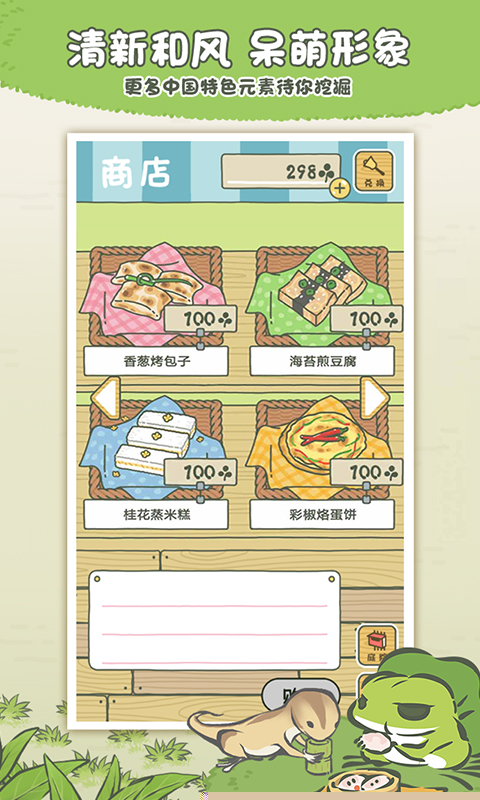 核心体验围绕庭院经营与旅行支持展开。庭院中生长的三叶草是基础货币,用于在商店购买旅行所需的食物、护身符及道具。定期收割三叶草,并利用稀有四叶草兑换更高级别的物品,是资源积累的关键。为青蛙准备行囊时,不同的食物组合将影响其旅行时长与可能抵达的区域,而装备如帐篷、碗具等则能提升旅途舒适度与遭遇特殊事件的概率。