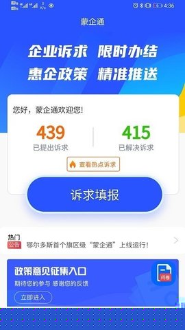 蒙企通是一款面向企业用户的综合性服务软件,通过数字化手段连接市场主体与政府部门,构建高效、精准的政企互动通道,整合了政策宣贯、诉求反馈、法律咨询与创业扶持等核心模块,依托大数据分析实现政策与企业的智能匹配,助力企业及时获取惠企信息、快速解决经营难题,从而优化营商环境,赋能企业高质量发展。