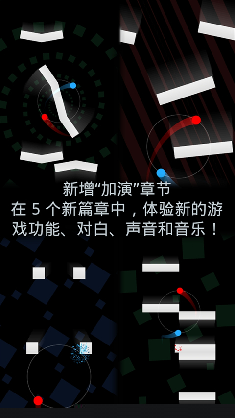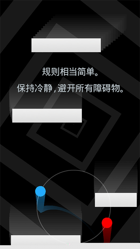 掌握二重奏duet的核心在于理解同步与预见。控制的红蓝双球以一个共同圆心进行旋转,通过点击屏幕左右两侧来分别控制其顺时针或逆时针转动。主要目标是让这对连体球体在向前自动滚动的过程中,避开所有迎面而来的白色几何障碍。这些障碍形态多变,可能是静止的条块,也可能是规律运动的锯齿或旋转的门扉。