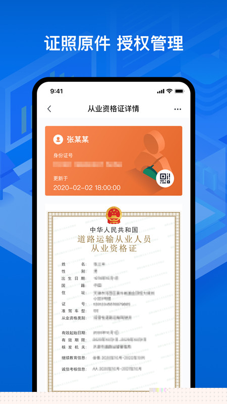 支持道路运输经营许可证、道路运输证、从业资格证等电子证照的申领、亮证、授权、核验全生命周期线上化管理。