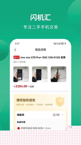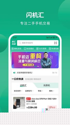 闪机汇是一款专注于二手手机交易的移动应用,集商品浏览、智能筛选、在线交易与售后服务于一体,构建了一个连接个人卖家与买家的可信赖平台,汇聚了从主流品牌到经典型号的丰富二手手机资源。通过直观的界面与严谨的验机流程,让用户以透明、高效的方式完成交易,在享受高性价比的获得安心的购物保障。