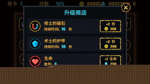 在攀登过程中,闪亮的宝石与偶尔出现的宝箱是重要目标。收集宝石可以累积分数,而开启宝箱则可能获得临时性的增益效果,短时间内无敌或分数加倍。更重要的长期投资在于每次对局结束后,使用积累的货币在商店中购买永久性升级。增强磁石能力可以扩大自动吸附宝石的范围,升级护甲则能提供一次免于碰撞伤害的机会。这些强化虽不改变操作本质,但能显著降低后续攻关的容错率,是挑战更高层数的基石。