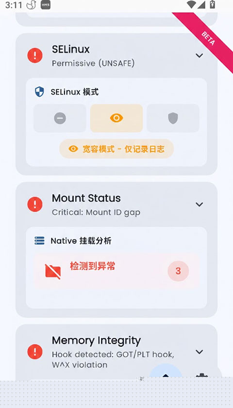 能够有效检测并区分当前主流的系统修改框架,包括Magisk及其Zygisk模式、KernelSU等,即使面对隐藏手段也能进行有效探查。