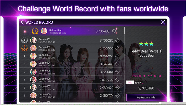 设立永久性全球高分排行榜,鼓励反复打磨技巧,争夺每首曲目的世界纪录保持者荣誉。