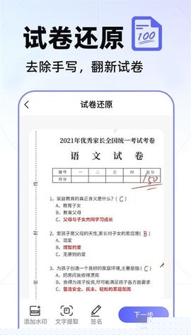 针对教育场景,提供了专门的试卷处理模块,可智能识别并擦除试卷上的手写笔迹,还原空白卷面,能对标准格式的口算题进行自动判对错,辅助教师快速完成初步批阅。