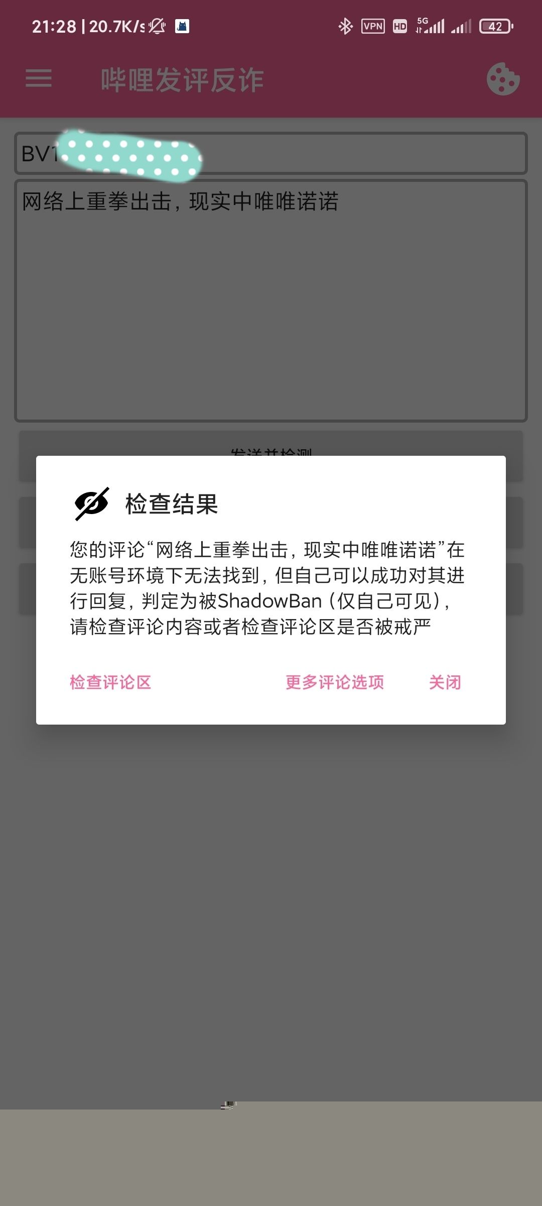 当检测到评论状态异常(如仅自己可见或被删除)时,在结果对话框中选择更多评论选项,即可找到申诉功能入口。点击后,插件会引导或协助用户完成向B站官方的申诉流程。