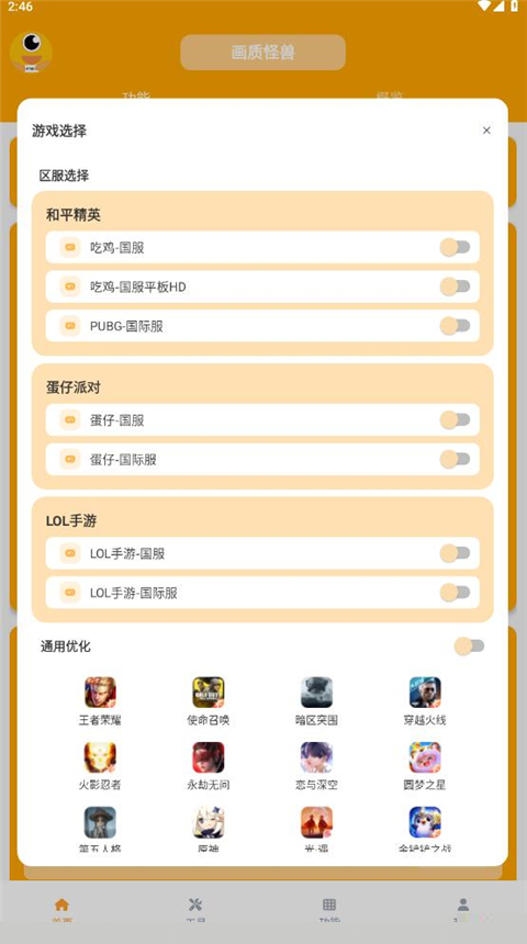 核心应用流程始于目标游戏的选择。用户需在主页从支持的列表中选定需要优化的作品,和平精英。随后,主界面会呈现与游戏相关的所有可调整选项,包括但不限于各类画质帧率组合包、超广角开关以及音质增强。