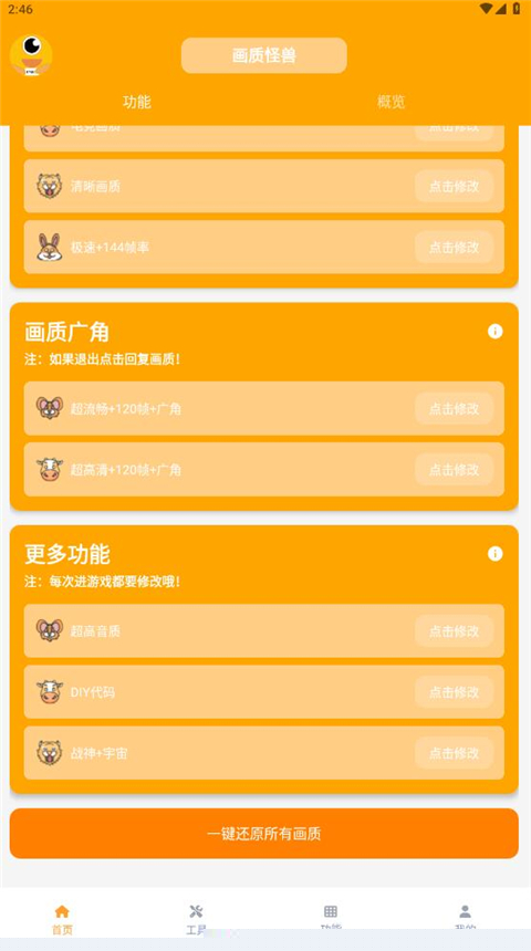 采用简洁直观的功能交互逻辑,大部分优化选项可实现选择-生效的一键操作,修改成功后进入游戏即可体验,降低了使用门槛。
