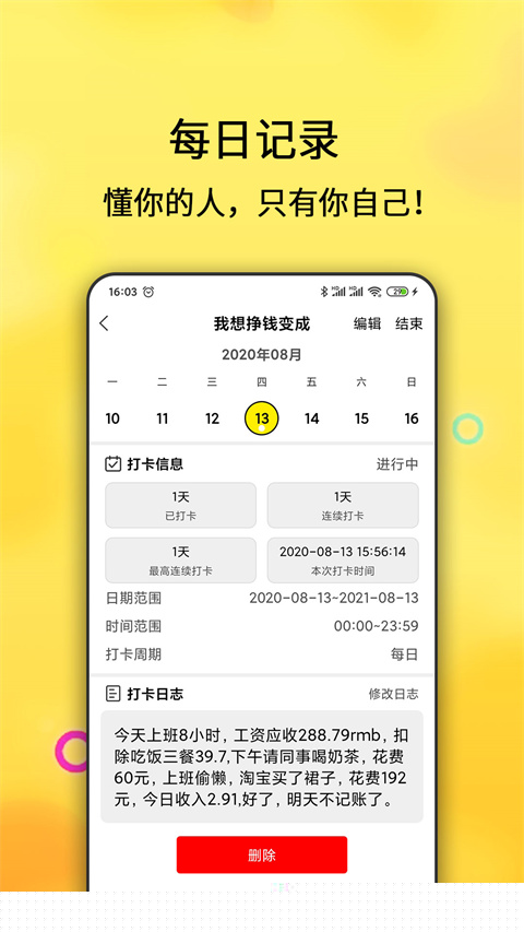 在打卡完成目标的允许用户附带记录当日心境,将行为数据与情绪变化相关联。