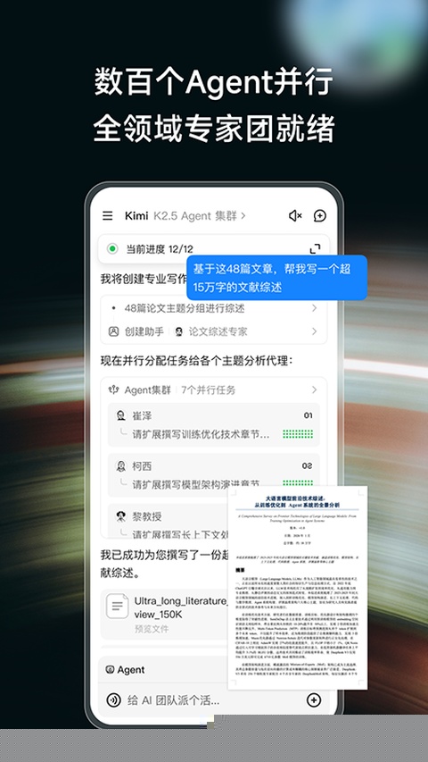 内置先进的智能体集群架构,可依据任务复杂度动态创建并协调多个子智能体并行工作,实现大规模、多步骤项目的自动化分解与执行。