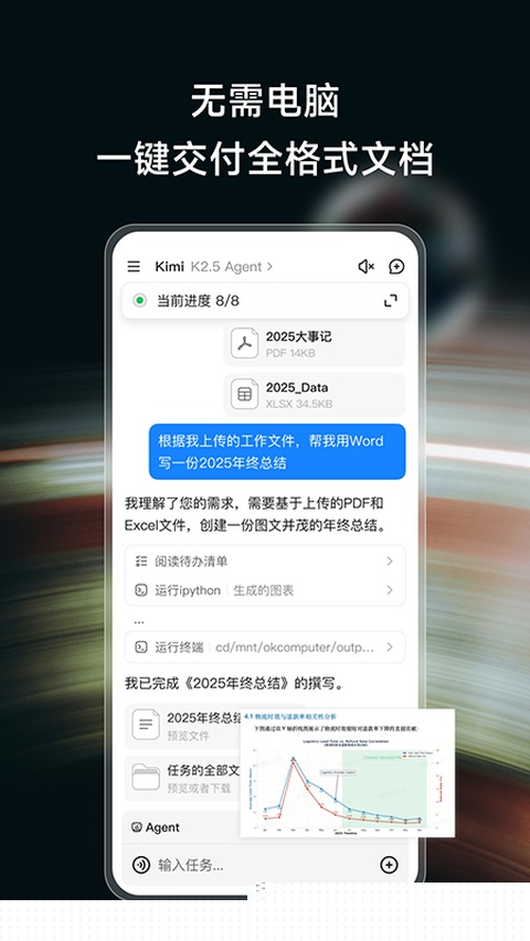 从原始数据输入到最终格式输出,可实现全自动处理。将一份市场调研数据自动转化为包含图表分析的Word报告,并进一步生成演讲用的PPT演示文稿。
