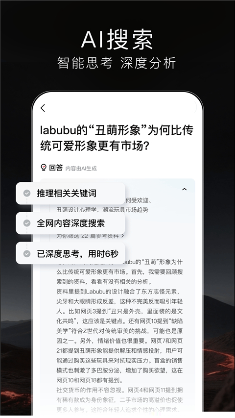 核心功能围绕智能搜索与影视观赏展开。启动应用后,用户会面对一个极为简洁的主界面,中央的搜索框是首要交互点。在此输入任何问题,无论是生活常识、学术查询还是网址导航,系统都将启动其智能处理流程。这一过程模拟深度思考,交叉验证多源信息,最终生成一个整合后的唯一答案页面,省去了在传统搜索引擎结果页中反复筛选、辨别广告的步骤。