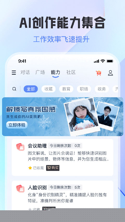 内置一个涵盖写作、绘图、视频创作、PPT生成、职业规划、健康分析等领域的能力超市。根据自身行业与需求,自由选取并组合这些能力模块,灵活赋能给自己创建的数字智能体,实现一站式任务处理与创意生产。