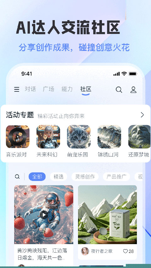 设立活跃的内容社区,展示大量由平台智能体生成的创意绘画、短视频、音乐及产品评测等优质内容。社区是一个成果展示空间,更成为用户获取灵感、交流AI应用心得、发现前沿创意的重要平台,形成了良性的内容创作与分享循环。