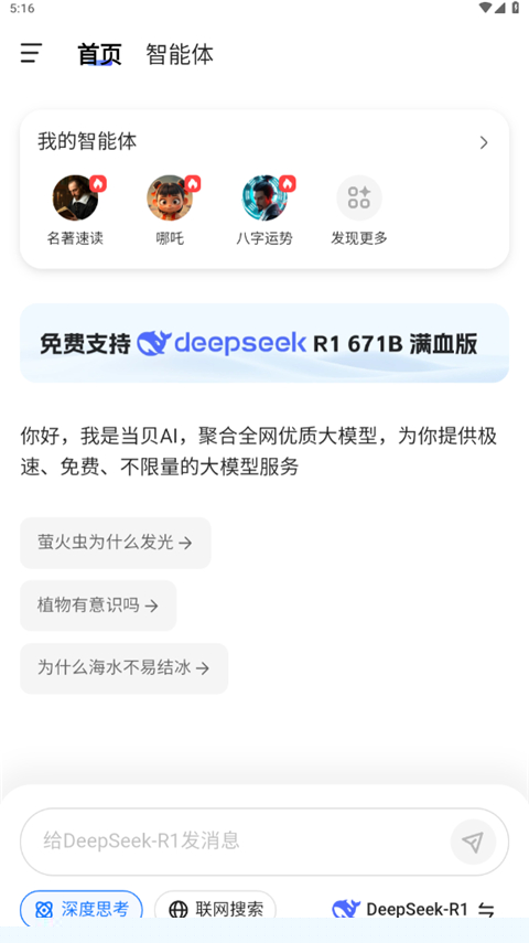 当贝AI是一款由杭州当贝网络科技精心打造的智能应用,聚合了当前前沿的多款大型语言模型,为用户提供高效、免费且不受限制的智能问答与创作服务。其核心在于整合了包括DeepSeek-R1 671B满血版在内的多个强大引擎,无需繁琐注册即可开启深度思考与联网搜索,覆盖工作、学习、创作等多重场景,并通过账号体系实现手机、电脑等多端数据无缝同步,带来流畅便捷的全平台智能体验。