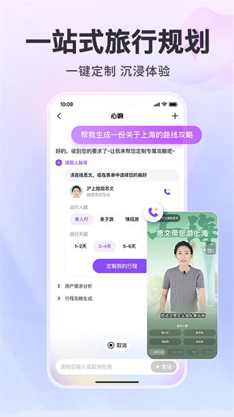融合文本、语音与拟真数字人向导,在特定场景如旅行规划中提供更自然、更具陪伴感的交互方式,帮助用户理清思路,细化需求。