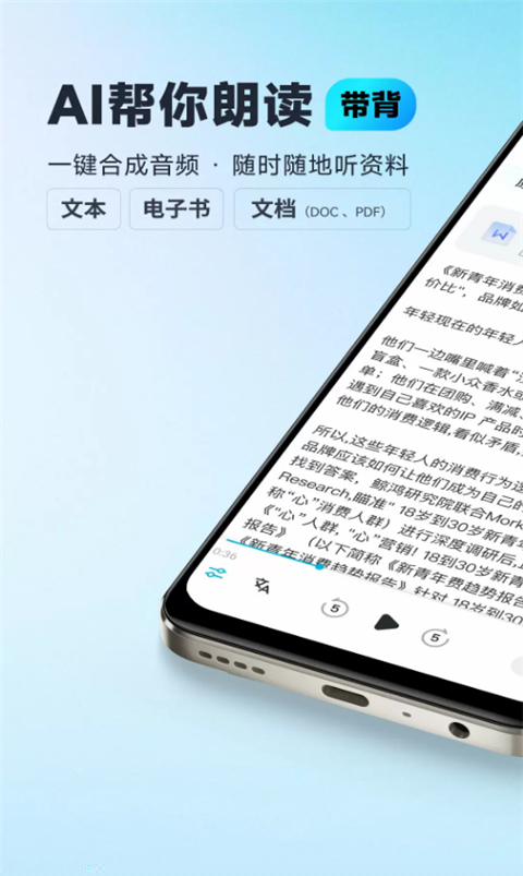核心体验围绕听展开。用户的主要目标是利用碎片化时间,通过听觉高效吸收各类文字信息。无论是学术文献、行业报告、网络长文还是外文资料,都可以导入转化为可随时播放的音频。操作逻辑直观:在应用内选择对应的功能模块,如文档朗读或链接转播客,上传文件或粘贴链接,系统便会自动处理并开始播放。用户可自由调节播放速度、切换AI主播音色,或在收听的查看同步高亮的原文文字。