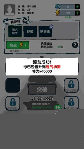 飞仙证道是一款以东方玄幻为背景的放置类角色扮演作品,将扮演一名求道者,在浩瀚的仙侠世界中开启从凡人到飞升的修行史诗。作品通过精妙的场景构建与丰富的系统交互,深度还原了传统修仙文化中的炼气、筑基、结丹、渡劫等核心环节,营造出浓厚的沉浸氛围。其独特的离线挂机机制,确保了在碎片化时间中也能稳步积累修为,而精心设计的顿悟与奇遇系统,则为成长路径增添了无限可能,让每一次登录都充满惊喜。