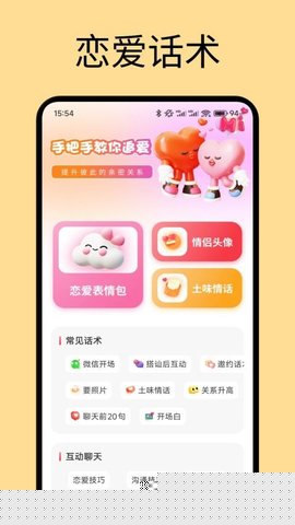 除文字话术外,同步集成大量风格多样的情侣主题表情包、头像及壁纸,丰富非语言沟通的维度与趣味性。