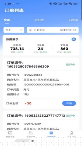 覆盖从用户启动充电、计费结算到订单完成的完整业务流程。支持按站点、时间、用户等多条件筛选查询历史订单,并展示详尽的消费明细与收入构成。