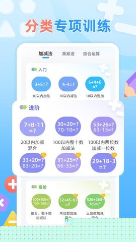 针对进位加法、连续减法、乘法口诀、带余数除法等细分难点提供集中训练,帮助用户攻克特定薄弱环节。