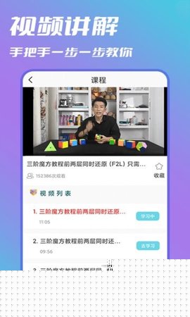 针对魔方还原的每一个层、每一个关键步骤,提供独立且可重复播放的高清教学视频,解决用户在看懂文字教程后仍无法正确操作的实践痛点。