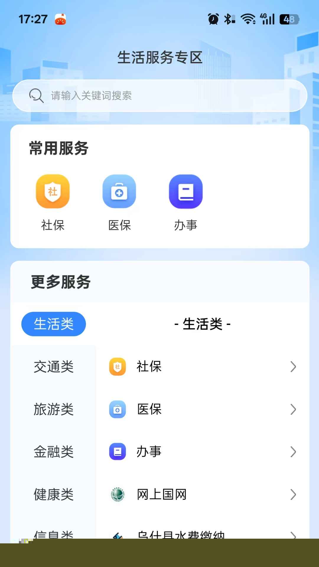 生活服务专区提供水电燃气缴费、交通违章处理、公积金查询等功能,用户可根据需求选择相应服务在线办理。