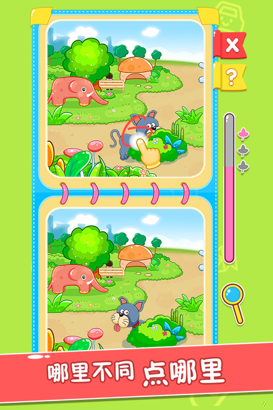 交互方式充分考虑了触屏设备的特性。发现不同点时,只需用手指直接点击一幅图的对应位置即可。成功点击后,该处会有视觉特效(如光圈闪烁或物体跳动)给予确认,并伴随欢快的音效。若点击错误,则不会有响应,避免负面提示带来挫败感。部分高级关卡设有时间限制或生命值设定,增加了挑战的趣味性。