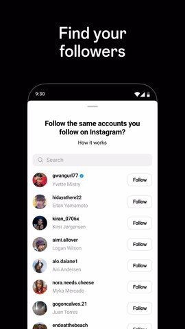 6、选择你想关注的人。完成上述步骤后,恭喜你,你已经成功注册了Threads。