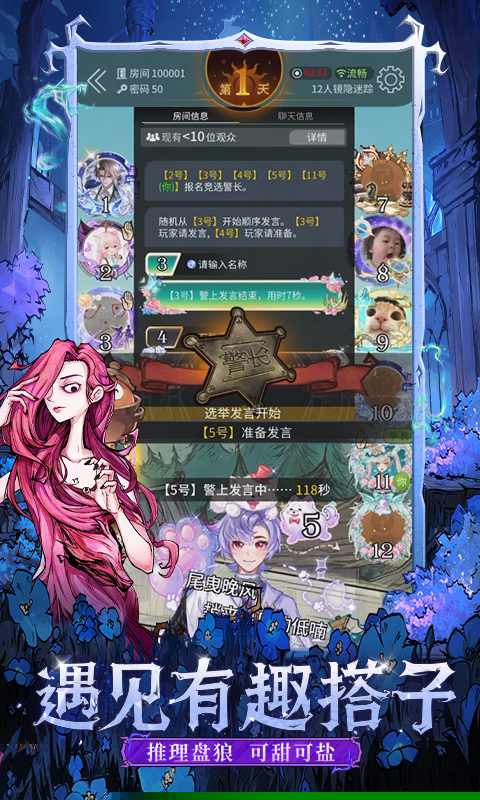内置预言家、女巫、猎人等经典身份,并持续扩充特色角色,构建层次丰富的战术选择空间。