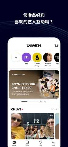 CO.BENX.WEVERSE是一款专注于连接全球韩流粉丝与偶像的官方互动社区软件,构建了一个集内容发布、即时交流、活动参与于一体的数字空间,让粉丝文化得以深度沉淀与实时共享。