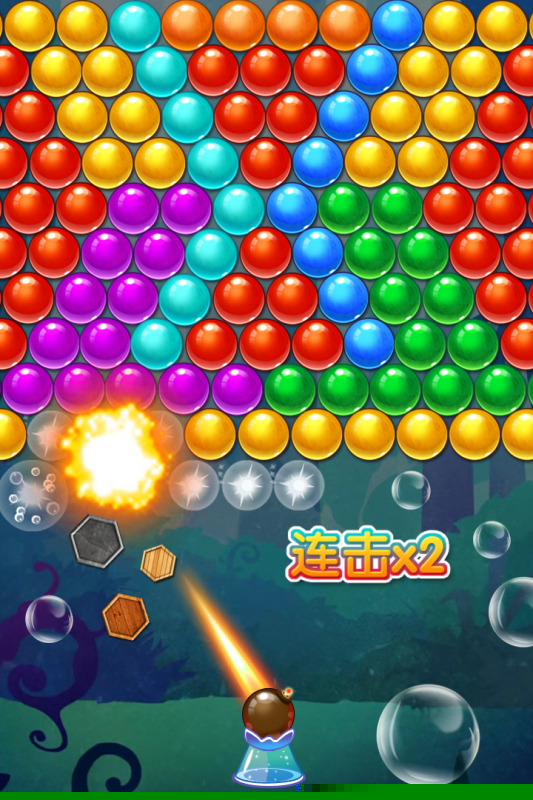 主要玩法围绕消除展开。控制屏幕底部的炮台,发射彩色泡泡至顶部的泡泡矩阵中。核心目标是阻止不断下压的泡泡群触及底部红线。每一次发射都需审慎选择,将新泡泡黏着在矩阵的合适位置。当同色泡泡连接数量达到三个或以上,这些泡泡便会从矩阵中消失。消除后,上方失去支撑的泡泡会因重力下落,可能形成新的同色连接,从而实现连锁消除,这是获取高分的关键。