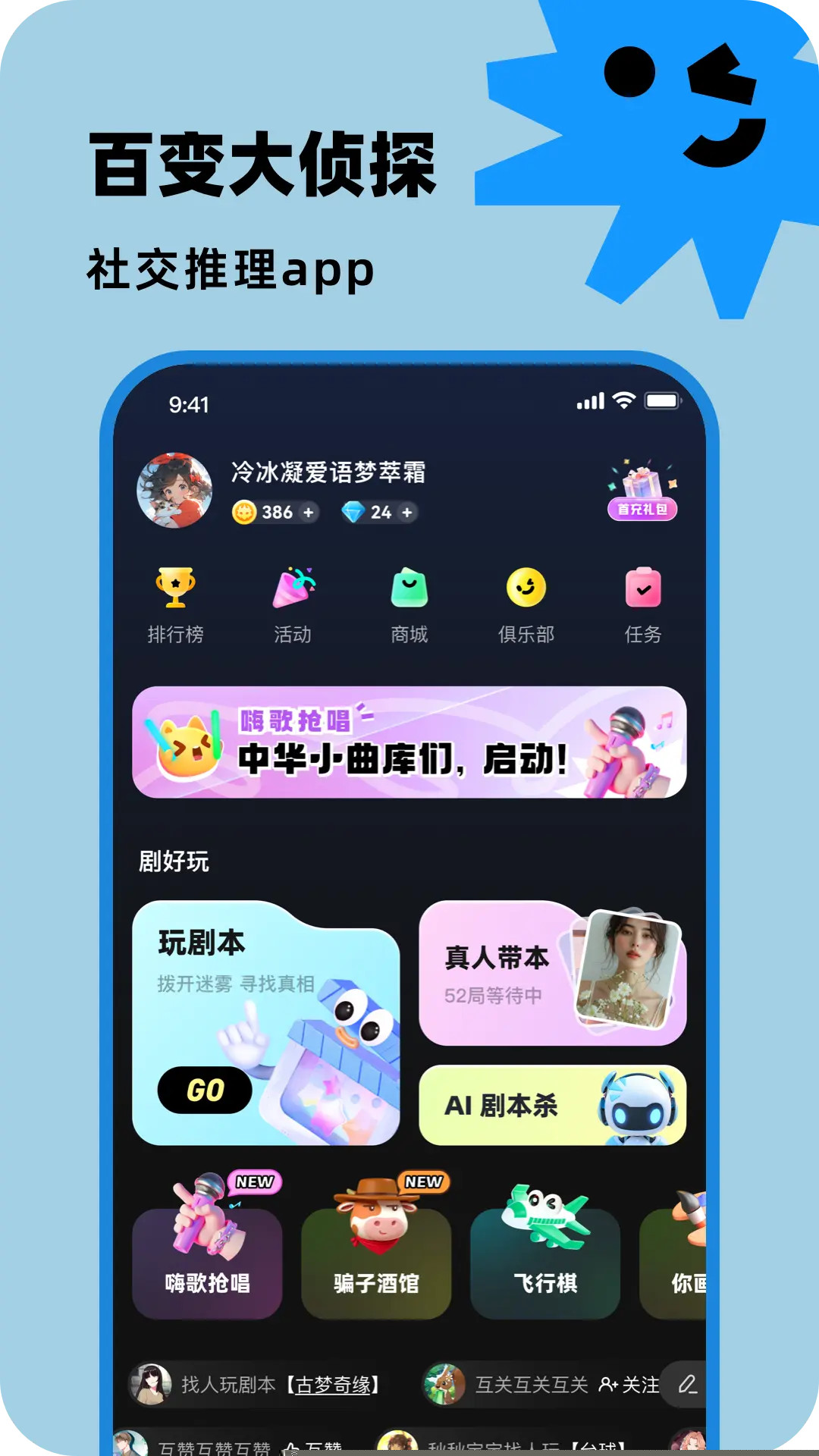 百变大侦探是一款集线上社交与逻辑推理于一体的真人角色扮演游戏软件,通过丰富的剧本设定和沉浸式互动体验,让用户在虚拟场景中化身不同角色,参与解谜破案的过程。软件结合语音聊天、线索搜集与多人协作机制,构建出充满悬念的剧本杀环境,适合喜爱推理、表演与社交的参与。