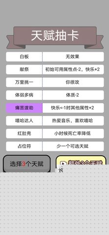 开局阶段提供丰富的天赋抽取与属性分配系统,可通过连抽获取稀有天赋,并自由调配初始属性,塑造独一无二的人生起点。