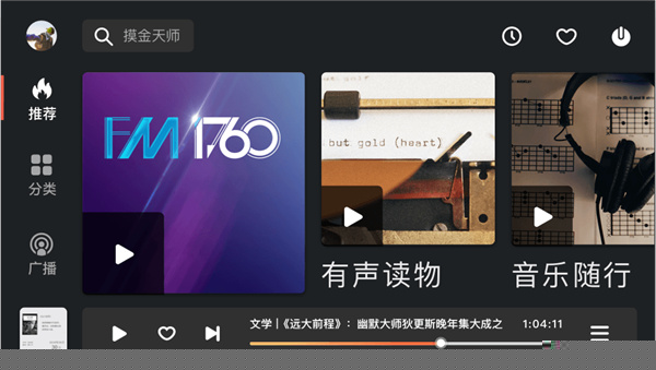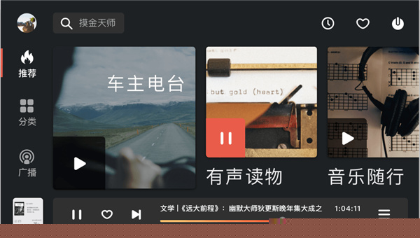 主界面采用瀑布流信息架构,在任一分类页面下,仅需一次点击或语音指令,即可开启对应频道的连续播放,实现一键即听的无缝体验。