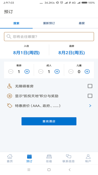 基于地理位置、日期、价格及酒店品牌的复合条件筛选,快速定位符合需求的住宿选项,并完成从房型选择、优惠软件到最终支付的完整预订闭环。