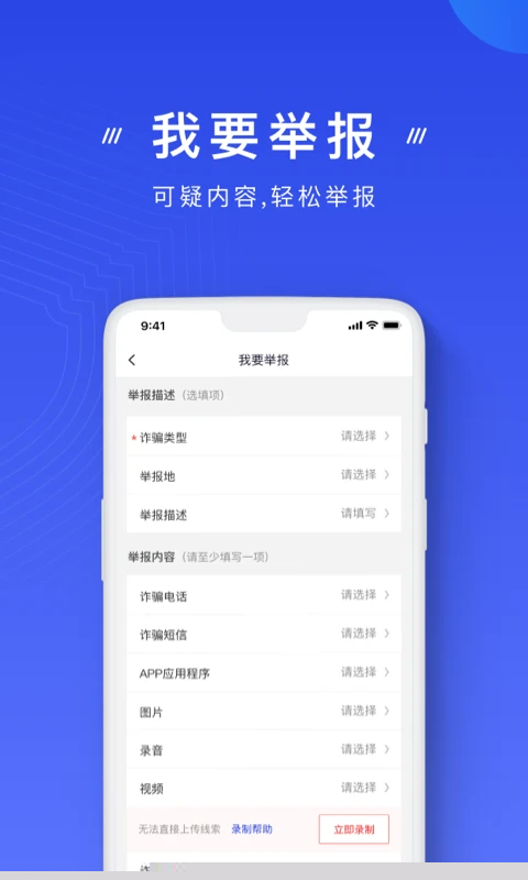 发现可疑情况可快速启动录屏录音,并通过线上渠道提交涉案线索。