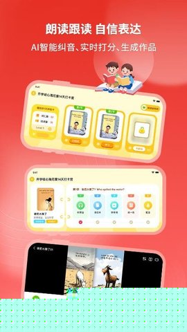 支持对电子绘本中的文字、图片进行点击发声,实现即点即读。孩子可跟随标准音频进行朗读,系统会生成发音报告,针对性纠正错误,解决口语练习缺乏指导与反馈的痛点。