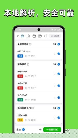 提供全选、标记、删除等批量操作选项,用户可对多个已取包裹进行签收或归档,极大提升了管理大量快递时的处理效率。