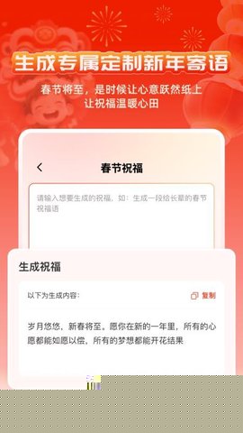 用户输入如新春、乔迁、开业等关键词后,可即时获得一副完整的、贴合主题的春联,解决了传统创作中需要深厚文学功底和耗时构思的痛点。