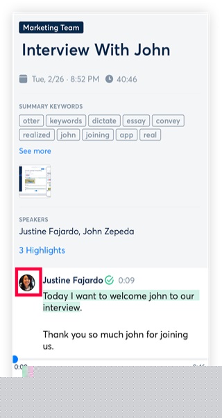 在播放录音时,文字稿会同步高亮显示当前朗读的句子或单词,用户亦可点击文本中的任意位置,从该处开始播放对应的录音片段。