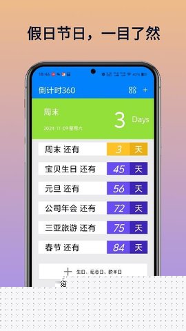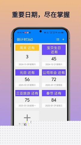 倒计时360是一款专注于时间管理与日程规划的智能应用,通过直观的界面与强大的功能,协助用户精准追踪各类重要日期。从个人生日、周年纪念到项目截止日、会议安排,使用者可便捷地录入事件并实时查看剩余时间。应用内嵌的智能分类与多视图展示模式,让日程管理变得清晰有序,确保每个关键节点都能被及时关注与处理。