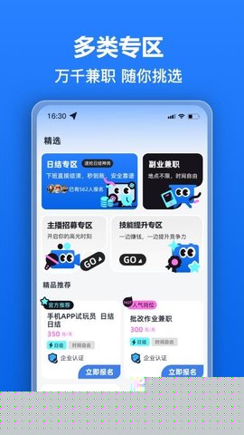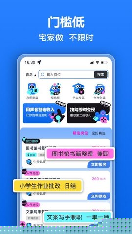 聚合了零售、教育、活动执行、线上助理、设计文案等多种行业的兼职需求,能够满足不同技能背景与兴趣爱好的用户群体,选择空间大。
