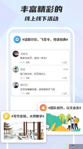 集成垂直写作社区,支持作品发布与点评,更提供基于创作主题的实时互动、经验分享及由资深作者主导的线上研讨,形成成长型学习生态。