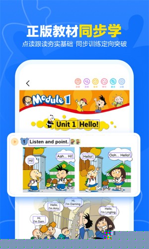 内容与外研社新标准英语教材完全同步,内置官方授权的课文、单词音频,支持即点即读功能,为学生创造原汁原味的语言环境,辅助纠正发音。