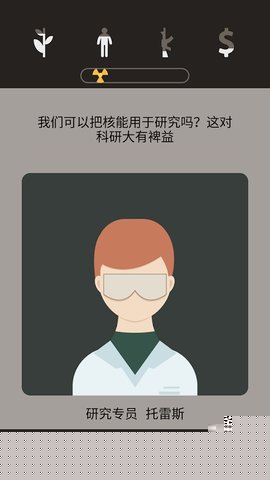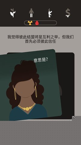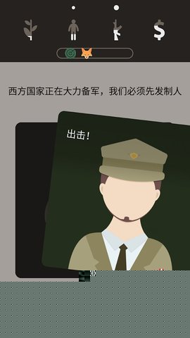 核心体验围绕国家治理面板展开。面板清晰展示了民心、能源、科技、军事及外交关系五项核心指标。所有行动均通过阅读剧情文本后,在屏幕下方出现的多项选择卡牌中滑动选取执行。每张卡牌代表一项具体政令或行动,会明确告知其对各项指标的潜在影响,推行配给制可能提升秩序但降低民心,开放技术交易可能加速科技但伴随情报风险。