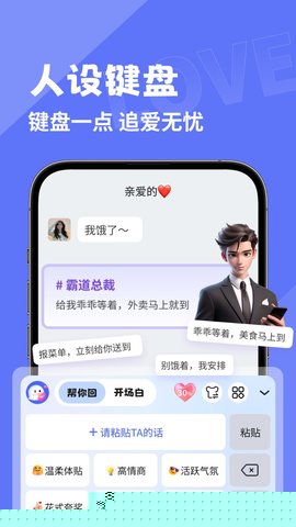 幸福键盘是一款专注于情感交流与社交互动的智能辅助应用,通过内置丰富多样的角色设定与情景话术,帮助用户在聊天过程中更自然、更自信地表达情感,支持个性化角色定制,涵盖温柔体贴、霸道总裁等多种流行人设,用户可根据实际沟通场景灵活切换,有效提升对话的流畅度与趣味性,让日常社交与情感沟通变得更加轻松高效。