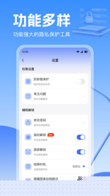 集成数字密码、自定义手势、生物识别等多种验证方式,用户可根据不同应用的安全级别和使用场景,自由组合与切换解锁方案。