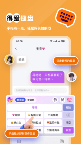 得爱键盘是一款专注于恋爱社交领域的智能输入辅助软件,通过整合情景化对话模板与实时语义分析技术,能够依据聊天对象的回应动态生成贴合语境的回复建议。帮助用户在亲密关系交流中克服词穷与尴尬,其内置的语境感知引擎可自动识别对话情绪与话题走向,从而提供更具温度与针对性的表达方案,让文字沟通也能传递细腻的情感层次。